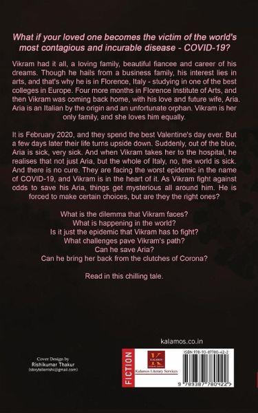 What if your loved one becomes the victim of the world's most contagious and incurable disease - covid-19? Vikram had it all, a loving family, beautiful fiancés and career of his dreams. Though he hails from a business family, his interest lies in arts, and that's why he is in Florence, Italy - studying in one of the best colleges in Europe. Four more months in Florence Institute of Arts, and then Vikram was coming back home, with his love and future wife, Aria. Aria is an Italian by the origin and an unfortunate orphan. Vikram is her only family, and she loves him equally. It is February 2020, and they spend the best Valentine's day ever. But a few days later their life turns upside down. Suddenly, out of the Blue, Aria is sick, very sick. And when Vikram takes her to the hospital, he realises that not just Aria, but the whole of Italy, no, the world is sick. And there is no cure. They are facing the worst epidemic in the name of covid-19, and Vikram is in the heart of it. As Vikram fight against odds to save his Aria, things get mysterious all around him. He is forced to make certain choices, but are they the right ones? What is the dilemma that Vikram faces? What is happening in the world? Is it just the epidemic that Vikram has to fight? What challenges pave vikram's path? Can he save Aria? Can he bring her back from the clutches of corona? Read in this chilling tale.