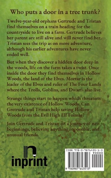 Who puts a door in a tree trunk? Twelve-year-old orphans Gertrude and Tristan find themselves on a train heading for the countryside to live on a farm. Gertrude is worried her missing parents will never find her. Tristan sees the trip as one more adventurer, which isn't going to end well. But when they discover a hidden door deep in the woods life on the farm soon takes a twist. Once inside the door they find themselves in Hollow Woods the land of the Elves. Mortar is the leader of the Elves and ruler of The Four Lands, where the Trolls, Goblins, and Dwarfs live. Strange things start to happen which threaten the very existence of Hollow Woods. Can Gertrude and Tristan help save Hollow Woods from the Evil High Elf Folmar? Join Gertrude and Tristan on a journey of new beginnings, discovery, believing anything is possible, and unusual friends.
