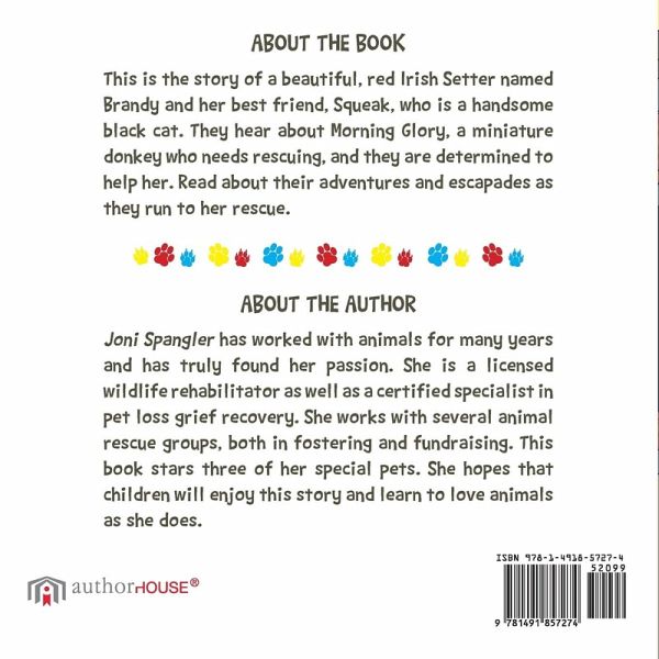 About the Book This is the story of a beautiful, red Irish Setter named Brandy and her best friend, Squeak, who is a handsome black cat. They hear about Morning Glory, a miniature donkey who needs rescuing, and they are determined to help her. Read about their adventures and escapades as they run to her rescue.