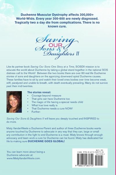 Having a special needs child is challenging in and of itself, but knowing your child, sibling or friend will die an untimely death to a paralyzing disease with no cure is an entirely different matter. Saving Our Sons & Daughters II has Forty Real-Life Stories about living with Duchenne Muscular Dystrophy geared to educate and uplift the World about Duchenne. Its time the most common muscular dystrophy is cured. Come read this heart touching and urgent SOS call to world. Duchenne needs your help.