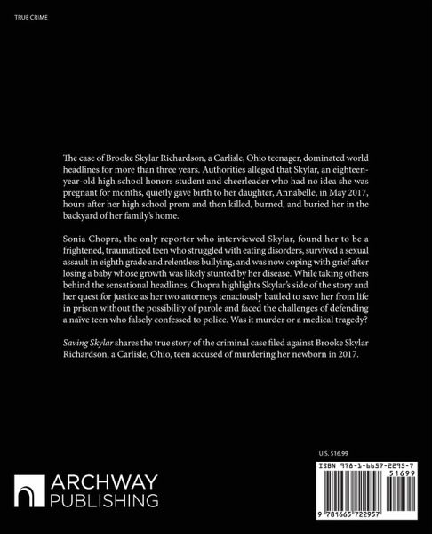 The case of Brooke Skylar Richardson, a Carlisle, Ohio teenager, dominated world headlines for more than three years. Authorities alleged that Skylar, an eighteen-year-old high school honors student and cheerleader who had no idea she was pregnant for months, quietly gave birth to her daughter, Annabelle, in May 2017, hours after her high school prom and then killed, burned, and buried her in the backyard of her family's home. Sonia Chopra, the only reporter who interviewed Skylar, found her to be a frightened, traumatized teen who struggled with eating disorders, survived a sexual assault in eighth grade and relentless bullying, and was now coping with grief after losing a baby whose growth was likely stunted by her disease. While taking others behind the sensational headlines, Chopra highlights Skylar's side of the story and her quest for justice as her two attorneys tenaciously battled to save her from life in prison without the possibility of parole and faced the challenges of defending a naïve teen who falsely confessed to police. Was it murder or a medical tragedy? Saving Skylar shares the true story of the criminal case filed against Brooke Skylar Richardson, a Carlisle, Ohio, teen accused of murdering her newborn in 2017.
