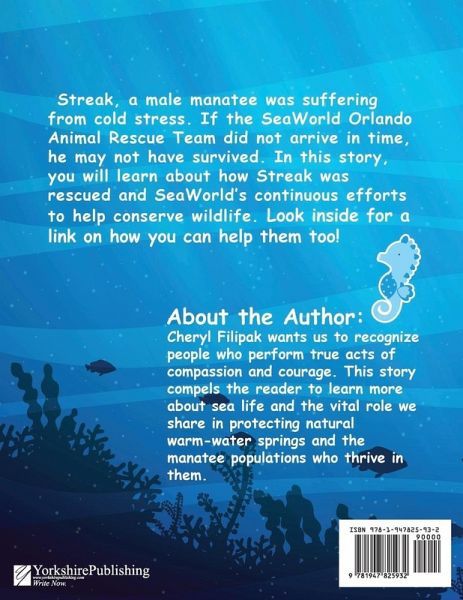 Streak, a male manatee was suffering from cold stress. If the SeaWorld Orlando Animal Rescue Team did not arrive in time, he may not have survived. In this story, you will learn about how Streak was rescued and SeaWorld's continuous efforts to help conserve wildlife. Look inside for a link on how you can help them too!