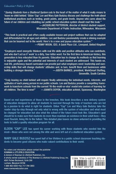 Employers need energetic thinkers with real life skills and positive attitudes who can contribute, and who don't act as if "work" is a dirty-four-letter-word. For the first time in American history, this generation is less educated than its parents. Education has to change its methods so that learning is enjoyable again, when the potential and interests of each student are addressed. This hands-on, real life, proficiency based curriculum can provide just what employers need-leadership and ownership skills-that will change students' attitudes, and in turn benefit them and businesses plus build a stronger America. -- Judith Barnes, President WorkSmart Staffing Greenville, South Carolina This book is practical and offers easily available lesson and project outlines which can be adapted and differentiated for all ages and abilities. The authors passionately create a shining example that can be beamed out to the world. Here's to a new and joyous education system. -- Penny Moon, CEO A Quiet Place Ltd. Liverpool, United Kingdom This book cuts to the heart of the matter, of what it really means to "leave no child behind." The truth about institutional practices such as testing, grade points, and grade levels is discussed and challenged. Anyone who cares about the future of our children and rebuilding our public school education system should read this book. -- Jacqueline Patterson, Director of District Student Support Wisconsin Department of Public instruction Milwaukee, Wisconsin Truly leaving "no child behind" will require finally addressing the individual needs, interests, and aptitudes of each young person in our public schools. Eldon Lee and Mary Gale Budzisz provide a compelling framework to transform schools from the current "fit-the-mold-or-else" model into centers of learning for all children. The time is now! -- Juanita Doyon, Education Activist Spanaway, Washington