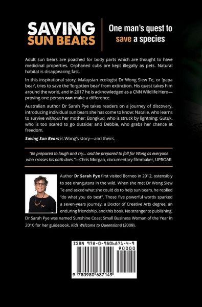 Australian author Dr Sarah Pye first visited Borneo in 2012, ostensibly to see orangutans in the wild. When she met Dr Wong Siew Te and asked what she could do to help sun bears, he replied "do what you do best". Those five powerful words sparked a seven-years journey, a Doctor of Creative Arts degree, an enduring friendship, and this book. No stranger to publishing, Sarah was named Sunshine Coast Small Business Woman of the Year in 2010 for her guidebook, Kids Welcome to Queensland (2009).