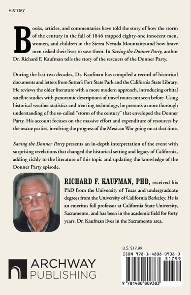 Books, articles, and commentaries have told the story of how the storm of the century in the fall of 1846 trapped eighty-one innocent men, women, and children in the Sierra Nevada Mountains and how brave men risked their lives to save them. In Saving the Donner Party, author Dr. Richard F. Kaufman tells the story of the rescuers of the Donner Party. During the last two decades, Dr. Kaufman has compiled a record of historical documents and letters from Sutter's Fort State Park and the California State Library. He reviews the older literature with a more modern approach, introducing orbital satellite studies with panoramic descriptions of travel routes not seen before. Using historical weather statistics and tree ring technology, he presents a more thorough understanding of the so-called "storm of the century" that enveloped the Donner Party. His account focuses on the massive effort and expenditure of resources by the rescue parties, involving the progress of the Mexican War going on at that time. Saving the Donner Party presents an in-depth interpretation of the event with surprising revelations that changed the historical setting and legacy of California, adding richly to the literature of this topic and updating the knowledge of the Donner Party episode.