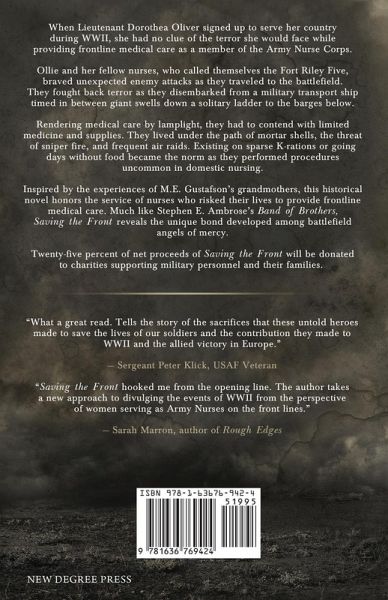When Lieutenant Dorothea Oliver signed up to serve her country during WWII, she had no clue of the terror she would face while providing frontline medical care as a member of the Army Nurse Corps. Ollie and her fellow nurses, who called themselves the Fort Riley Five, braved unexpected enemy attacks as they travelled to the battlefield. They fought back terror as they disembarked from a military transport ship timed in between giant swells down a solitary ladder to the barges below. Rendering medical care by lamplight, they had to contend with limited medicine and supplies. They lived under the path of mortar shells, the threat of sniper fire, and frequent air raids. Existing on sparse K-rations or going days without food became the norm as they performed procedures uncommon in domestic nursing. Inspired by the experiences of M.E. Gustafson's grandmothers, this historical novel honors the service of nurses who risked their lives to provide frontline medical care. Much like Stephen E. Ambrose's Band of Brothers, Saving the Front reveals the unique bond developed among battlefield angels of mercy. Twenty-five percent of net proceeds of Saving the Front will be donated to charities supporting military personnel and their families.