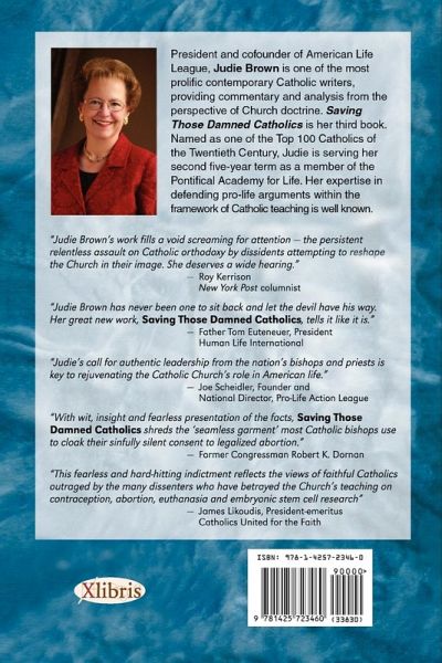Saving Those Damned Catholics chronicles the reasons why the current mess within the Catholic Church is not something that should surprise anyone, whether Catholic, Protestant, or just curious. After all, as the story unfolds you will learn how a bureaucracy has replaced individual commitment; and how politics has become far too appealing to the majority of Catholic bishops. It is no surprise that Americans scoff at Catholic teachings on birth control, abortion and euthanasia. The statistics tell the tale: most Catholics don't know what the Church teaches on these matters of life and death, and if they do, they choose to disagree and - ho-hum - the hierarchy moves on. Saving Those Damned Catholics outlines the logic behind the most controversial teachings in the Church today, and exposes the arguments put forth by priests and bishops who clearly do not agree with some of these teachings themselves. Astounding as it may seem, there are reasons why federal funding has become more important than protecting innocent life; why popularity among the most liberal of politicians has trumped Pope Benedict XVI's call to be good shepherds and, indeed, to be counter-cultural. There are reasons why homosexuals are still in the seminaries; and there are reasons why the vast majority of Catholics use birth control and condone abortion. Ever wonder why people like Bill O'Reilly, Ted Kennedy and others in public life get away with distorting Catholic teaching? Scoffing at the truth? Taking it upon themselves to "correct" the Pope on national television? This book will give you a bird's eye view into what is being said and what is not being done to set the record straight. As Judie Brown put this book together she was able to interview several Catholic priests, including two bishops. One of the most interesting comments she heard is that the United States Conference of Catholic Bishops is not only a major part of the problem these days, but is an entity that should be deconstructed - abolished, as one priest put it. The bureaucracy has become synonymous with doing nothing to rock the proverbial political boat. But you'll just have to read the book to learn more. In summary, Saving Those Damned Catholics exposes the warts on the underbelly of the Catholic leadership in America today, and it is not a pretty picture. Too many among them are caught up in a twisted vision of what it takes to effectively lead Catholics. There is too much moral relativism and too little desire to say what is right, especially when doing so will bring down the wrath of the media and maybe even a few politicians. Regardless of your opinion about Catholics and their Church, don't miss the chance to read one woman's account of history - a history that continues to unfold before our eyes. [ENDORSEMENTS] "Judie Brown's work fills a void screaming for attention - the persistent relentless assault on Catholic orthodoxy by dissidents attempting to reshape the church in their image. She spells it out and names the names without violating Christian charity. She deserves a wide hearing." - Ray Kerrison, New York Post columnist Judie Brown has never been one to sit back and let the devil have his way. Her great new work, Saving Those Damned Catholics, tells it like it is. I thank Judie for her forthright analysis of the state of the Church. She is not just telling us what is wrong - she is giving us our marching orders. - Father Tom Euteneuer, President, Human Life International We can always count on Judie Brown and American Life League to keep up with the shenanigans of the so-called "Catholic" leaders. Judie's call for authentic leadership from the nation's bishops and priests is key to rejuvenating the Catholic Church's role in American life. - Joe Scheidler, Director, Pro-Life Action League With wit, insight and fearless presentation of the