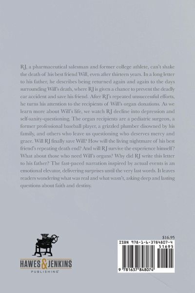 RJ, a pharmaceutical salesman and former college athlete, can't shake the death of his best friend Will, even after thirteen years. In a long letter to his father, he describes being returned again and again to the days surrounding Will's death, where RJ is given a chance to prevent the deadly car accident and save his friend. After RJ's repeated unsuccessful efforts, he turns his attention to the recipients of Will's organ donations. As we learn more about Will's life, we watch RJ decline into depression and self-sanity-questioning. The organ recipients are a pediatric surgeon, a former professional baseball player, a grizzled plumber disowned by his family, and others who leave us questioning who deserves mercy and grace. Will RJ finally save Will? How will the living nightmare of his best friend's repeating death end? And will RJ survive the experience himself? What about those who need Will's organs? Why did RJ write this letter to his father? The fast-paced narration inspired by actual events is an emotional elevator, delivering surprises until the very last words. It leaves readers wondering what was real and what wasn't, asking deep and lasting questions about faith and destiny.