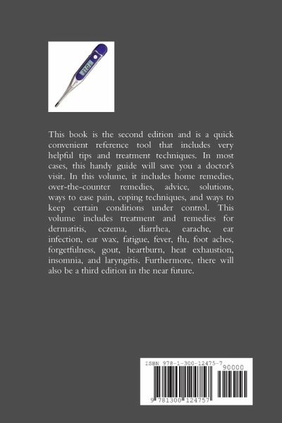This book is the second edition and is a quick convenient reference tool that includes very helpful tips and treatment techniques. In most cases, this handy guide will save you a doctor's visit. In this volume, it includes home remedies, over-the-counter remedies, advice, solutions, ways to ease pain, coping techniques, and ways to keep certain conditions under control. This volume includes treatment and remedies for dermatitis, eczema, diarrhea, earache, ear infection, ear wax, fatigue, fever, flu, foot aches, forgetfulness, gout, heartburn, heat exhaustion, insomnia, and laryngitis. Furthermore, there will also be a third edition in the near future. The first edition covers helpful tips for acne, allergies, arthritis, backache, bad breath, bites, boils, blood pressure, boils, bronchitis, burns, carpal tunnel syndrome, high cholesterol, colds, cold sores, constipation, and diabetes.