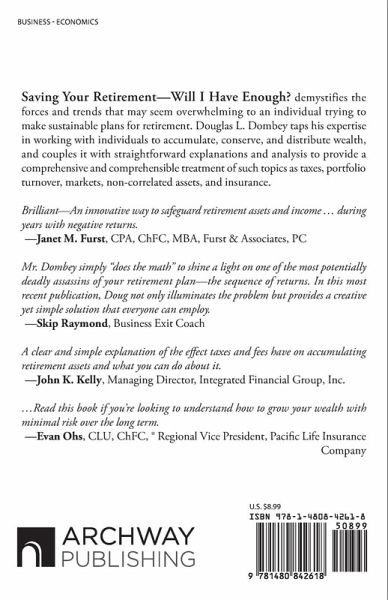 Saving Your Retirement-Will I Have Enough? demystifies the forces and trends that may seem overwhelming to an individual trying to make sustainable plans for retirement. Douglas L. Dombey taps his expertise in working with individuals to accumulate, conserve, and distribute wealth, and couples it with straightforward explanations and analysis to provide a comprehensive and comprehensible treatment of such topics as taxes, portfolio turnover, markets, non-correlated assets, and insurance. Brilliant-An innovative way to safeguard retirement assets and income … during years with negative returns. -Janet M. Furst, CPA, ChFC, MBA, Furst & Associates, PC Mr. Dombey simply "does the math" to shine a light on one of the most potentially deadly assassins of your retirement plan-the sequence of returns. In this most recent publication, Doug not only illuminates the problem but provides a creative yet simple solution that everyone can employ. -Skip Raymond, Business Exit Coach A clear and simple explanation of the effect taxes and fees have on accumulating retirement assets and what you can do about it. -John K. Kelly, Managing Director, Integrated Financial Group, Inc. …Read this book if you're looking to understand how to grow your wealth with minimal risk over the long term. -Evan Ohs, CLU, ChFC, ® Regional Vice President, Pacific Life Insurance Company
