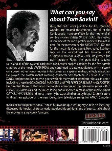 **This is not the Limited Edition Coffee Table Version, that version is only available through Dark Ink directly. This is the mass market hardcover edition. What can you say about Tom Savini? Well, the facts work just fine for this multi-hit wonder. He created the zombies and all of the iconic special makeup effects for the mother of all zombie movies, DAWN OF THE DEAD. He created Jason, one of the most prolific movie villains of all time, for the movie franchise FRIDAY THE 13THand for the mega-hit video game. He created Leatherface in the much-loved fan favorite TEXAS CHAINSAW MASSACRE PART TWO. He created the crate creature Fluffy, the grave-rising cadaver Nate, and all of the twisted, cockroach-filled, water-soaked zombies for the five horrific chapters of the movie CREEPSHOW and continued to dazzle audiences with his work on a dozen other horror movies in his career as a special makeup effects magician. He played the crotch rocket-wearing character Sex Machine in FROM DUSK TILL DAWN and mesmerized movie-goers with his many other standout roles as an actor, including those in GRINDHOUSE, MACHETE, and THE PERKS OF BEING A WALLFLOWER. He directed three of the most memorable episodes of the television series TALES FROM THE DARKSIDE and the much loved and respected remake of the movie NIGHT OF THE LIVING DEAD, and most recently he was called upon by his pal Greg Nicotero to direct an episode of the new Creepshow television series for AMC's Shudder. In this beautiful picture book, Tom, in his own unique writing style, tells his life story, discusses his movies, shares anecdotes, give his opinions, and of course, talks about the movies in a way only Tomcan.