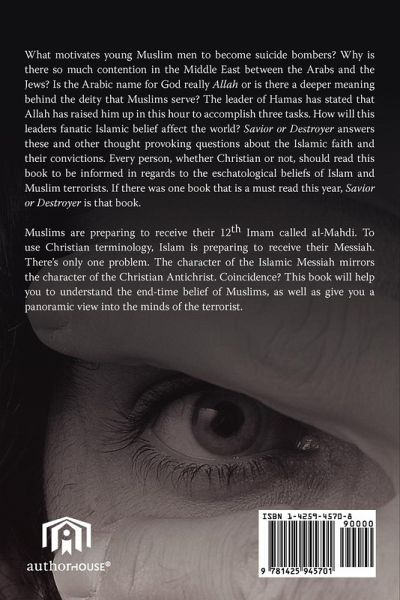 What motivates young Muslim men to become suicide bombers? Why is there so much contention in the Middle East between the Arabs and the Jews? Is the Arabic name for God really Allah or is there a deeper meaning behind the deity that Muslims serve? The leader of Hamas has stated that Allah has raised him up in this hour to accomplish three tasks. How will this leaders fanatic Islamic belief affect the world? Savior or Destroyer answers these and other thought provoking questions about the Islamic faith and their convictions. Every person, whether Christian or not, should read this book to be informed in regards to the eschatological beliefs of Islam and Muslim terrorists. If there was one book that is a must read this year, Savior or Destroyer is that book. Muslims are preparing to receive their 12th Imam called al-Mahdi. To use Christian terminology, Islam is preparing to receive their Messiah. There's only one problem. The character of the Islamic Messiah mirrors the character of the Christian Antichrist. Coincidence? This book will help you to understand the end-time belief of Muslims, as well as give you a panoramic view into the minds of the terrorist.