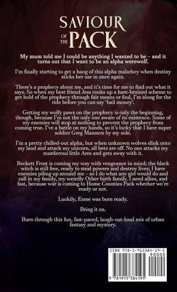 Saviour of the Pack Blurb: My mum told me I could be anything I wanted to be - and it turns out that I want to be an alpha werewolf. I'm finally starting to get a hang of this alpha malarkey when destiny sticks her oar in once again. There's a prophecy about me, and it's time for me to find out what it says. So when my best friend Jess cooks up a hare-brained scheme to get hold of the prophecy through fair means or foul, I'm along for the ride before you can say 'bail money'. Getting my wolfy paws on the prophecy is only the beginning, though, because I'm not the only one aware of its existence. Some of my enemies will stop at nothing to prevent the prophecy from coming true. I've a battle on my hands, so it's lucky that I have super soldier Greg Manners by my side. I'm a pretty chilled-out alpha, but when unknown wolves slink onto my land and attack my unicorn, all bets are off. No one attacks my murderous little Ares and gets away with it. Beckett Frost is coming my way with vengeance in mind; the black witch is still free, ready to steal powers and destroy lives; I have enemies piling up around me - so I do what any girl would do and call in my family, my weirdly Other birth family. I need allies, and fast, because war is coming to Home Counties Pack whether we're ready or not. Luckily, Esme was born ready. ¿¿Bring it on. Description: Fans of Annette Marie, Helen Harper and Patricia Briggs will love this series. This is a fun urban fantasy mystery novel featuring a strong female protagonist, with werewolves, gargoyles, and witches.