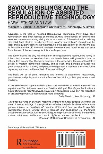 Advances in the field of Assisted Reproductive Technology (ART) have been revolutionary. This book focuses on the use of ARTs in the context of families who seek to conceive a matching sibling donor as a source of tissue to treat an existing sick child. Such children have been referred to as 'saviour siblings'. Considering the legal and regulatory frameworks that impact on the accessibility of this technology in Australia and the UK, the work analyses the ethical and moral issues that arise from the use of the technology for this specific purpose. The author claims the only justification for limiting a family's reproductive liberty in this context is where the exercise of reproductive decision-making results in harm to others. It is argued that the harm principle is the underlying feature of legislative action in Western democratic society, and as such, this principle provides the grounds upon which a strong and persuasive argument is made for a less-restrictive regulatory approach in the context of 'saviour siblings'. The book will be of great relevance and interest to academics, researchers, practitioners and policy makers in the fields of law, ethics, philosophy, science and medicine.