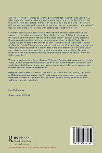 Genetic screening technologies involving pre-implantation genetic diagnosis (PGD) raise particular issues about selective reproduction and the welfare of the child to be born. How does selection impact on the identity of the child who is born? Are children who are selected for a particular purpose harmed or treated as commodities? How far should the state interfere with parents' reproductive choices? Currently, concerns about the welfare of the child in selective reproduction have focused on the individual interests of the child to be born. This book re-evaluates the welfare of the child through the controversial topic of saviour sibling selection. Drawing on relational feminist and communitarian ethics, Michelle Taylor-Sands argues that the welfare of the child to be born is inextricably linked with the welfare of his/her family.¿ The author proposes a relational model for selective reproduction based on a broad conception of the welfare of the child that includes both individual and collective family interests. By comparing regulation in the UK and Australia, the book maps out how law and policy might support a relational model for saviour sibling selection. With an interdisciplinary focus, Saviour Siblings: A Relational Approach to the Welfare of the Child in Selective Reproduction will be of particular interest to academics and students of bioethics and law as well as practitioners and policymakers concerned with the ethics of selective reproduction.