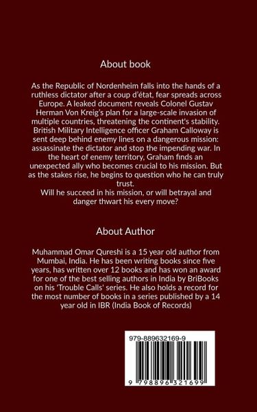As the Republic of Nordenheim falls into the hands of a ruthless dictator after a coup d'état, fear spreads across Europe. A leaked document reveals Colonel Gustav Herman Von Kreig's plan for a large-scale invasion of multiple countries, threatening the continent's stability. British Military Intelligence officer Graham Calloway is sent deep behind enemy lines on a dangerous mission: assassinate the dictator and stop the impending war. In the heart of enemy territory, Graham finds an unexpected ally who becomes crucial to his mission. But as the stakes rise, he begins to question who he can truly trust. Will he succeed in his mission, or will betrayal and danger thwart his every move?