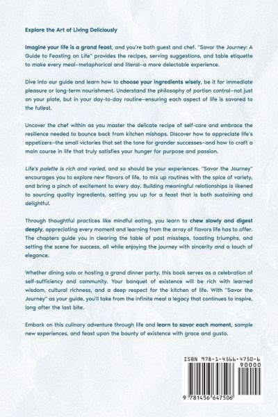 Explore the Art of Living Deliciously Imagine your life is a grand feast, and you're both guest and chef. "Savor the Journey: A Guide to Feasting on Life" provides the recipes, serving suggestions, and table etiquette to make every meal-metaphorical and literal-a more delectable experience. Dive into our guide and learn how to choose your ingredients wisely, be it for immediate pleasure or long-term nourishment. Understand the philosophy of portion control-not just on your plate, but in your day-to-day routine-ensuring each aspect of life is savored to the fullest. Uncover the chef within as you master the delicate recipe of self-care and embrace the resilience needed to bounce back from kitchen mishaps. Discover how to appreciate life's appetizers-the small victories that set the tone for grander successes-and how to craft a main course in life that truly satisfies your hunger for purpose and passion. Life's palette is rich and varied, and so should be your experiences. "Savor the Journey" encourages you to explore new flavors of life, to mix up routines with the spice of variety, and bring a pinch of excitement to every day. Building meaningful relationships is likened to sourcing quality ingredients, setting you up for a feast that is both sustaining and delightful. Through thoughtful practices like mindful eating, you learn to chew slowly and digest deeply, appreciating every moment and learning from the array of flavors life has to offer. The chapters guide you in clearing the table of past missteps, toasting triumphs, and setting the scene for success, all while enjoying the journey with sincerity and a touch of elegance. Whether dining solo or hosting a grand dinner party, this book serves as a celebration of self-sufficiency and community. Your banquet of existence will be rich with learned wisdom, cultural richness, and a deep respect for the kitchen of life. With "Savor the Journey" as your guide, you'll take from the infinite meal a legacy that continues to inspire, long after the last bite. Embark on this culinary adventure through life and learn to savor each moment, sample new experiences, and feast upon the bounty of existence with grace and gusto.