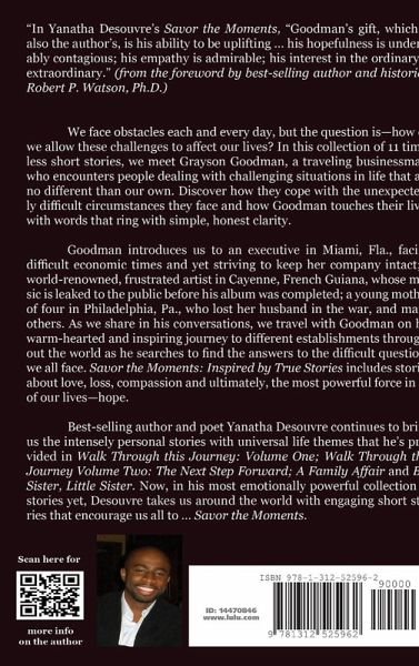 In this collection of 11 timeless short stories, we meet Grayson Goodman, a traveling businessman, who encounters people dealing with challenging situations in life that are no different than our own. Discover how they cope with the unexpectedly difficult circumstances they face and how Goodman touches their lives with words that ring with simple, honest clarity. Goodman introduces us to an executive in Miami, Fla., facing difficult economic times and yet striving to keep her company intact; a world-renowned, frustrated artist in Cayenne, French Guiana, whose music is leaked to the public before his album was completed and many others. As we share in his conversations, we travel with Goodman on his warm-hearted and inspiring journey to different establishments throughout the world as he searches to find the answers to the difficult questions we all face. Savor the Moments: includes stories about love, loss, compassion, and ultimately, the most powerful force in all of our lives--hope.