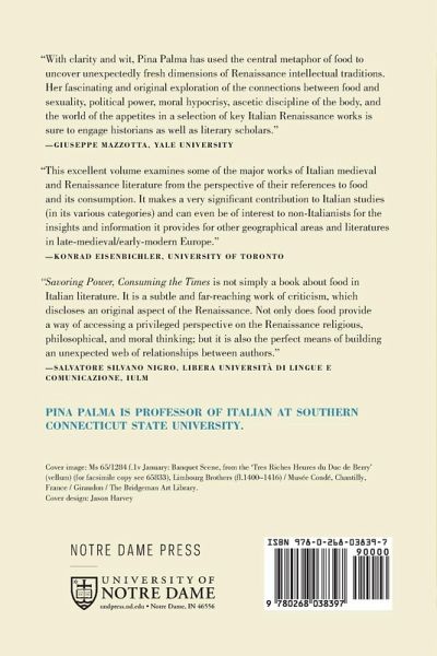 Pina Palma's Savoring Power, Consuming the Times: The Metaphors of Food in Medieval and Renaissance Italian Literature is an innovative look at the writings of five important Italian authors-Boccaccio's Decameron, Pulci's Morgante, Boiardo's Innamorato, Ariosto's Furioso, and Aretino's Ragionamento. Through the prism of gastronomy, Palma examines these key works in the Western literary canon, bringing into focus how their authors use food and gastronomy as a means to critique the social, political, theological, philosophical, and cultural beliefs that constitute the fabric of the society in which they live. Palma begins with the anthropological principle that food represents the universal transformation of nature into culture and that it functions as a language that distinguishes every society and its culture from others. This suggests that food-its preparation, presentation, and consumption-is more than merely a source of nourishment. Rather, Palma argues, foodstuffs function as ethical and aesthetic instruments through which the literary hero's virtues and flaws, achievements and failures, can be gauged. Food also serves as a means to maintain, as well as to negotiate, power, social hierarchy, and relationships between the powerful and the powerless. Touching on three centuries that were pivotal for Italian culture, literature, and history, as well as three literary genres, Palma's analysis connects the descriptions and references to food found in these works with the wider culture of Italy in the late medieval and early modern period. "With clarity and wit, Pina Palma has used the central metaphor of food to uncover unexpectedly fresh dimensions of Renaissance intellectual traditions. Her fascinating and original exploration of the connections between food and sexuality, political power, moral hypocrisy, ascetic discipline of the body, and the world of the appetites in a selection of key Italian Renaissance works is sure to engage historians as well as literary scholars." -Giuseppe Mazzotta, Yale University "This excellent volume examines some of the major works of Italian medieval and Renaissance literature from the perspective of their references to food and its consumption. It makes a very significant contribution to Italian studies (in its various categories) and can even be of interest to non-Italianists for the insights and information it provides for other geographical areas and literatures in late-medieval/early-modern Europe." -Konrad Eisenbichler, University of Toronto "Savoring Power, Consuming the Times is not simply a book about food in Italian literature. It is a subtle and far-reaching work of criticism, which discloses an original aspect of the Renaissance. Not only does food provide a way of accessing a privileged perspective on the Renaissance religious, philosophical, and moral thinking; but it is also the perfect means of building an unexpected web of relationships between authors." -Salvatore Silvano Nigro, Libera Universita di Lingue e Comunicazione, IULM