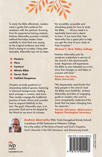 Some books on how to read the Bible are academically informative, but their rationality can make God seem distant. Other books are spiritually vibrant but provide few tools that truly help God's people read the Bible better. Readers need a guide that combines the academic with the spiritual--that integrates textual analysis with the illuminating and transformational work of the Holy Spirit. Drawing from his experience training students to study the Bible, Andrew Abernethy provides a holistic method that helps readers listen carefully to what God was saying to the original audience and what God is saying to us today. Using clear examples, he lays out six steps: Chapters provide guidance on interpreting biblical genres, factoring in historical backgrounds, reading each passage in context, tracing the redemptive storyline of Scripture, and more. Then, building on a strong grasp of Scripture's meaning, readers engage the traditional practice of lectio divina and consider how to respond faithfully to the text. The goal, Abernethy says, is to encounter God and to be shaped by the Word as we savor its richness. Filled with practical features such as illustrations, maps, timelines, and discussion questions, Savoring Scripture is a valuable guide for students and anyone who wants to study the Bible more effectively. God has given us a Bible that is for the hungry--for those willing both to depend on God for provision and to put in the mental effort to enjoy the feast.