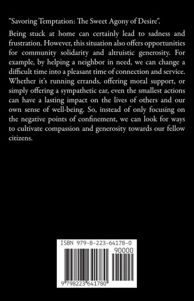 "Savoring Temptation: The Sweet Agony of Desire". Being stuck at home can certainly lead to sadness and frustration. However, this situation also offers opportunities for community solidarity and altruistic generosity. For example, by helping a neighbor in need, we can change a difficult time into a pleasant time of connection and service. Whether it's running errands, offering moral support, or simply offering a sympathetic ear, even the smallest actions can have a lasting impact on the lives of others and our own sense of well-being. So, instead of only focusing on the negative points of confinement, we can look for ways to cultivate compassion and generosity towards our fellow citizens.