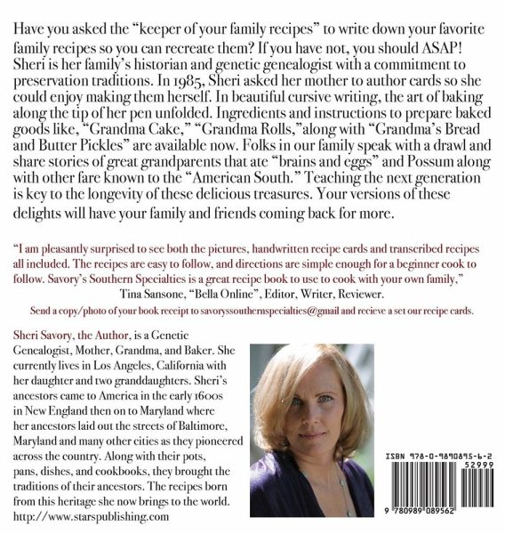 Raised on family recipes under the direction of grandmothers, aunts and her mother she grew to find her passion was in baking. Passing this along to the next generations is key to her, and this book is her attempt to share a bit of her heritage with the world. She is a mother, grandmother, sister and aunt that carries on these traditions daily. Sheri Savory, the Author, is a Genetic Genealogist, Mother, Grandma, and Baker. She currently lives in Los Angeles, California with her daughter and two granddaughters. Sheri's ancestors came to America in the early 1600's in New England then on to Maryland where her ancestor (8x great grandfather) laid out the streets of Baltimore, Maryland and many other cities as they pioneered across the country. Along with their pots, pans, dishes, and cookbooks, they brought the traditions of their ancestors.