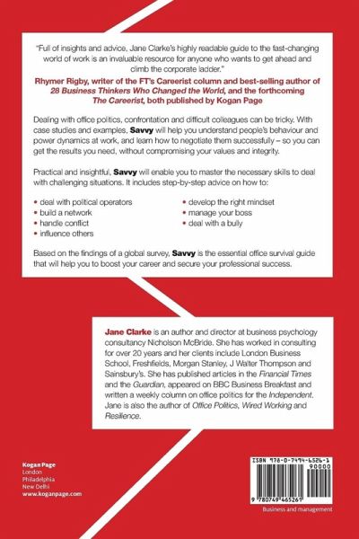 Dealing with office politics, conflict and difficult people at work, without compromising your values and integrity, can be tricky. With case studies and examples, Savvy will help you understand colleagues' behaviour and power dynamics at work, and learn how to negotiate them successfully. Practical and insightful, Savvy will enable you to master the necessary skills to deal with difficult situations. It includes step-by-step advice on how tobuild a network, develop the right mindset, handle conflict, manage your boss, influence others and deal with a bully. Savvy is the essential office survival guide that will help you to boost your career and ensure your professional success.