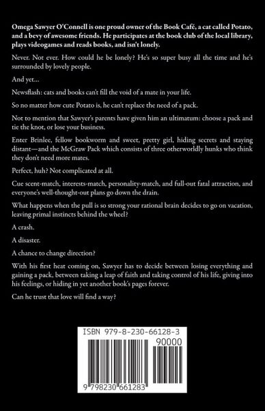 Omega Sawyer O'Connell is one proud owner of the Book Café, a cat called Potato, and a bevy of awesome friends. He participates at the book club of the local library, plays videogames and reads books, and isn't lonely. Never. Not ever. How could he be lonely? He's so super busy all the time and he's surrounded by lovely people. And yet... Newsflash: cats and books can't fill the void of a mate in your life. So no matter how cute Potato is, he can't replace the need of a pack. Not to mention that Sawyer's parents have given him an ultimatum: choose a pack and tie the knot, or lose your business. Enter Brinlee, fellow bookworm and sweet, pretty girl, hiding secrets and staying distant-and the McGraw Pack which consists of three otherworldly hunks who think they don't need more mates. Perfect, huh? Not complicated at all. Cue scent-match, interests-match, personality-match, and full-out fatal attraction, and everyone's well-thought-out plans go down the drain. What happens when the pull is so strong your rational brain decides to go on vacation, leaving primal instincts behind the wheel? A crash. A disaster. A chance to change direction? With his first heat coming on, Sawyer has to decide between losing everything and gaining a pack, between taking a leap of faith and taking control of his life, giving into his feelings, or hiding in yet another book's pages forever. Can he trust that love will find a way? * This is a sweet omegaverse standalone novel with low angst, four gorgeous guys and a delta girl who find happiness together, accepting themselves and finding trust and love in each other. This story contains M/M, knotting, heats and ruts. Please note that this is not a shifter story, but it is set in a world where apart from gender, we have a designation as alpha, beta, omega, or more. Omegas are more submissive and are generally paired with dominant alphas. This is an oversimplification of course, I hope that in the course of the story it all becomes clear.*