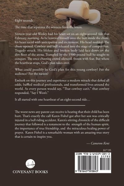 Eight seconds… The time that separates the winners from the losers. Sixteen-year-old Wesley had his heart set on an eight-second ride that February morning. As he lowered himself onto the bull inside the chute, his heart raced with anticipation and excitement. His head nodded. The chute opened. Cowboy and bull released into the stage of competition. Tragedy struck. His lifeless and broken body laid face down on the dirt floor of the arena. Trampled by the 1900-pound bull he sought to conquer. The once cheering crowd silenced, frozen with fear. But where the heartbeat stops, God’s plan takes over. What could possibly be God’s plan for this young cowboy? For the audience? For the nation? Embark on this journey and experience a modern miracle that defied all odds, baffled medical professionals, and transformed lives around the world. As every person would say, "That cowboy can’t," that cowboy responded, "Say I Won’t." It all started with one heartbeat of an eight-second ride…