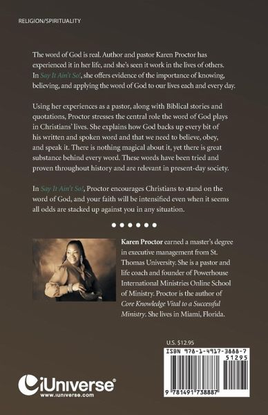The word of God is real. Author and pastor Karen Proctor has experienced it in her life, and she's seen it work in the lives of others. In Say It Ain't So!, she offers evidence of the importance of knowing, believing, and applying the word of God to our lives each and every day. Using her experiences as a pastor, along with Biblical stories and quotations, Proctor stresses the central role the word of God plays in Christians' lives. She explains how God backs up every bit of his written and spoken word and that we need to believe, obey, and speak it. There is nothing magical about it, yet there is great substance behind every word. These words have been tried and proven throughout history and are relevant in present-day society. In Say It Ain't So!, Proctor encourages Christians to stand on the word of God, and your faith will be intensified even when it seems all odds are stacked up against you in any situation.