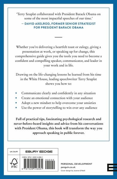 Whether you're delivering a heartfelt toast or eulogy, giving a presentation at work, or speaking up for change, this comprehensive guide gives you the tools you need to become a confident and compelling speaker, communicator, and leader in your work and in life. Drawing on the life-changing lessons he learned from his time in the White House, leading speechwriter Terry Szuplat shows you how to: ¿ Communicate clearly and confidently in any situation ¿ Create an emotional connection with your audience ¿ Adopt a new mindset to help overcome your anxieties ¿ Use the power of storytelling to win over any audience Full of practical tips, fascinating psychological research and never-before-heard insights and advice from conversations with President Obama, this book will transform the way you approach speaking in public forever.