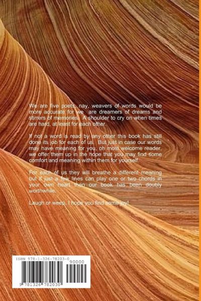 We are five poets, nay, weavers of words would be more accurate for we are dreamers of dreams and stirrers of memories and this is a collection of poems reflecting just that. As sisters we share a common bond of love and life experiences and this treasury of words, which is drawn from our hearts and souls, has a special meaning for us. However just in case our words may have meaning for you, oh most welcome reader, we offer them up in the hope that you may find some comfort and meaning within them for yourself. For each of us they will breathe a different meaning but if just a few lines can play one or two chords in your own heart then our book has been doubly worthwhile. Laugh or weep, I hope you find some joy!