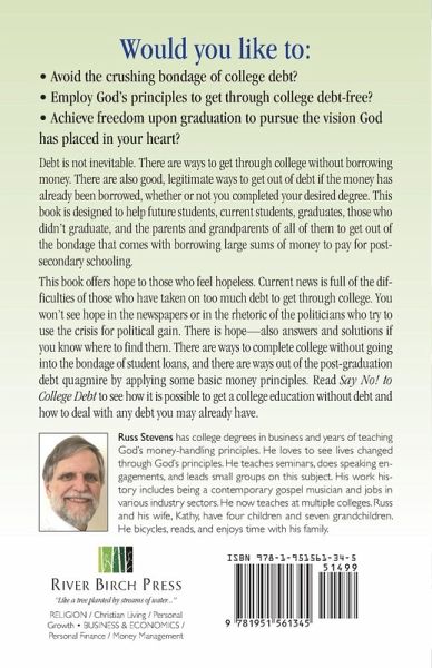 Would you like to: ¿ Avoid the crushing bondage of college debt? ¿ Employ God's principles to get through college debt-free? ¿ Achieve freedom upon graduation to pursue the vision God has placed in your heart? Debt is not inevitable. There are ways to get through college without borrowing money. There are also good, legitimate ways to get out of debt if the money has already been borrowed, whether or not you completed your desired degree. This book is designed to help future students, current students, graduates, those who didn't graduate, and the parents and grandparents of all of them to get out of the bondage that comes with borrowing large sums of money to pay for post-secondary schooling. This book offers hope to those who feel hopeless. Current news is full of the difficulties of those who have taken on too much debt to get through college. You won't see hope in the newspapers or in the rhetoric of the politicians who try to use the crisis for political gain. There is hope-also answers and solutions if you know where to find them. There are ways to complete college without going into the bondage of student loans, and there are ways out of the post-graduation debt quagmire by applying some basic money principles. Read Say No! to College Debt to see how it is possible to get a college education without debt and how to deal with any debt you may already have.