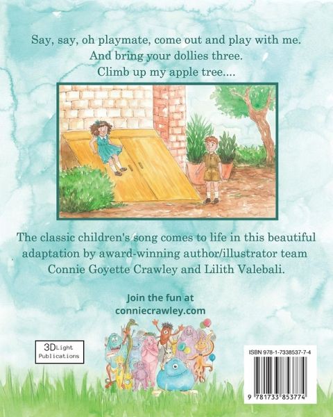 Say, say oh playmate, come out and play with me. And bring your dollies three. Climb up my apple tree.... The timeless playground song of apple trees, rain barrels, cellar doors, and enduring friendship is brought to life in beautiful watercolor illustrations by award-winning author/illustrator team Connie Goyette Crawley and Lilith Valebali.
