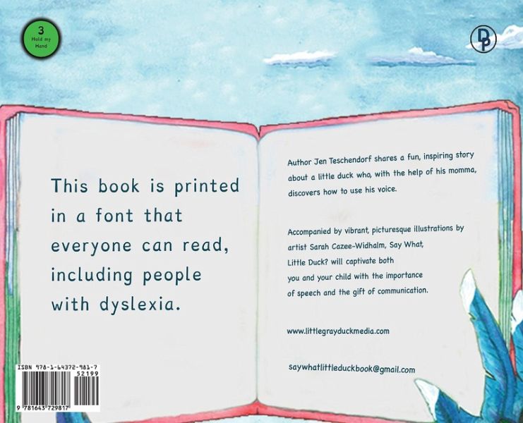 This book is Dyslexic inclusive; it is printed in a font that everyone can read, including people with dyslexia. Author Jen Teschendorf shares a fun, inspiring story about a little duck who, with the help of his momma, discovers how to use his voice. Accompanied by vibrant, picturesque illustrations by artist Sarah Cazee-Widhalm, Say What, Little Duck? will captivate both you and your child with the importance of speech and the gift of communication. www.littlegrayduckmedia.com saywhatlittleduckbook@gmail.com