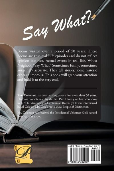 Poems written over a period of 50 years. These poems are true real Life episodes and do not reflect opinion but fact. Actual events in real life. Whoa Neighbor "Say What" Sometimes funny, sometimes amazingly accurate. They tell stories, some historic others humorous. This book will grab your attention and hold it to the very end.