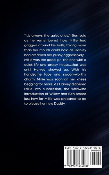 A salacious DDLG and ABDL themed love story for the age play fetishist. "It’s always the quiet ones," Ben said as he remembered how Millie had gagged around his balls, taking more than her mouth could hold as Harvey had creamed her pussy aggressively. Millie was the good girl, the one with a quiet life and pretty house…that was until Harvey showed up. With his handsome face and swoon-worthy charm, Millie was soon on her knees begging for more. As Harvey diapered Millie into submission, the whirlwind introduction of Willow and Ben tested just how far Millie was prepared to go to please her new Daddy. Please note: This story contains heavy sexually explicit content, DDLG & MDLG Age Play and ABDL themes. It features diaper changes (wet), lactation, spanking, punishments, orgy, Dominants and a submissive. The characters in this book are consenting adults engaged in a variety of kinky, fun activities and this novel is intended for adult readers only. If you are looking for a tantalizing DDLG story… Then scroll up and get your copy today!