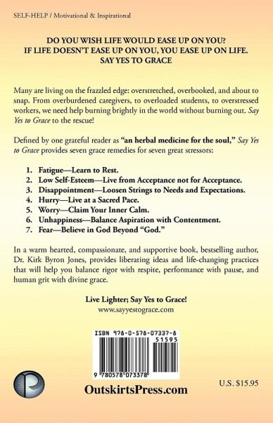 Many are living on the frazzled edge: overstretched, overbooked, and about to snap. From over-loaded students, to burdened-down moms, to over-worked business persons, we need help burning brightly in the world without burning out. Say Yes to Grace offers 7 Grace Solutions for 7 Great Stressors: 1. Fatigue----Learn to Rest. 2. Low Self-Esteem----Live from Acceptance not for Acceptance. 3. Disappointment----Loosen Strings to Needs and Expectations. 4. Hurry----Live at a Sacred Pace. 5. Worry----Claim Your Inner Calm. 6. Unhappiness----Balance Aspiration with Contentment. 7. Fear----Believe in God Beyond "God." In a warm hearted, compassionate, and supportive book, bestselling author, Dr. Kirk Byron Jones, offers liberating ideas and life-changing practices that will help readers balance rigor with respite, performance with pause, and human grit with God's grace. "Don't Let the Grind Wear You Down; Grace Yourself!"