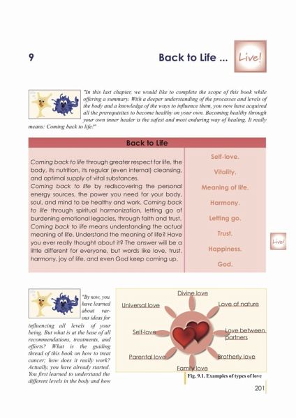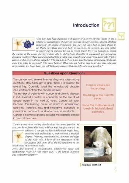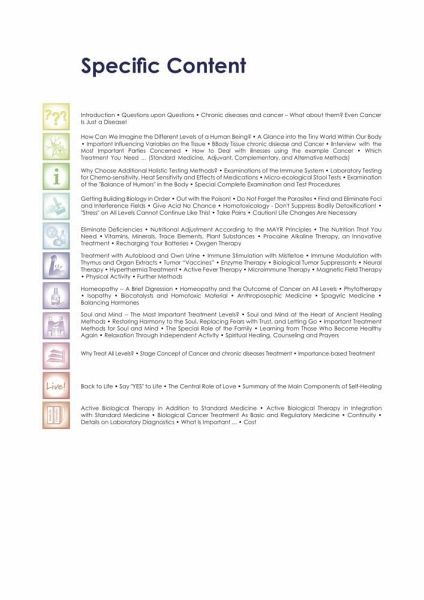 The topic of cancer is abundant in it's diversity of information and therefore challenging to successfully manage on a long term run. There are many therapeutical recommendations for the one or the other biological evidence based therapy method, however also many counterarguments. Neither conventional nor alternative medicine have the problem of cancer control and management fully understood. Those persons affected by the illness often lack the foundation, the fundamental concept of their inner healing strength. They become simple standardized objects of treatment trials. But cancer is a symptom of multifocal collections based on individual, very specific complex synergies of interference fields (triggers).