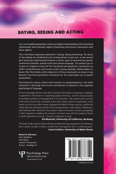 Our use of spatial prepositions carries an implicit understanding of the functional relationships both between objects themselves and human interaction with those objects. This is the thesis rigorously explicated in Saying, Seeing and Acting. It aims to account not only for our theoretical comprehension of spatial relations but our ability to intercede with efficacy in the world of spatially related objects. Only the phenomenon of functionality can adequately account for what even the simplest of everyday experiences show to be the technically problematic, but still meaningful status of expressions of spatial location in contentious cases. The terms of the debate are established and contextualised in Part One. In the Second Section, systematic experimental evidence is drawn upon to demonstrate specific covariances between spatial world and spatial language. The authors go on to give an original account of the functional and geometric constraints on which comprehension and human action among spatially related objects is based. Part Three looks at the interaction of these constraints to create a truly dynamic functional geometric framework for the meaningful use of spatial prepositions. Fascinating to anyone whose work touches on psycholinguistics, this book represents a thorough and incisive contribution to debates in the cognitive psychology of language.