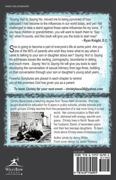 "Saying Yes! to Saying No, moved me to being convicted of how calloused I had become to the influences in our world today, and yet I felt challenged to take a stand against those same influences for my sons. If you have children or grandchildren, you will want to teach them to "Say No" when it counts, and this book will give you the tools to start now!" -Ryan Knight, D.C. Sex is going to become a part of everyone's life at some point. Are you one of the 90% of parents who wish they knew what to say when it came to talking to your son or daughter about sex? Saying Yes! to Saying No will equip you with scripture, and communication tools to give you confidence to become the parent who is meeting the needs of the 87% of teens who say it would be easier to maintain a sexually pure lifestyle if their parents would have open conversations with them about sex. Saying Yes! to Saying No addresses issues like sexting, pornography, boundaries in dating, and much more. Saying Yes! to Saying No will give you tools to start developing the conversation of sexual intimacy from age three, building on that conversation through your son or daughter's young adult years. Powerful Scriptures are placed in each chapter to remind you of the promises God has given you as a parent. To book Christy for your next event - christybaca28@yahoo.com