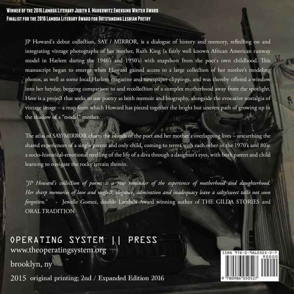2016 Lambda Literary Award for Lesbian Poetry, Finalist. JP Howard's debut collection, SAY/MIRROR, is a dialogue of history and memory, reflecting on and integrating vintage photographs of her mother, Ruth King (a fairly well known African American runway model in Harlem during the 1940's and 1950's) with snapshots from the poet's own childhood. This manuscript began to emerge when Howard gained access to a large collection of her mother's modeling photos, as well as some local Harlem magazine and newspaper clippings, and was thereby offered a window into her heyday, begging comparison to and recollection of a complex motherhood away from the spotlight. Here is a project that seeks to use poetry as both memoir and biography, alongside the evocative nostalgia of vintage image a map from which Howard has pieced together the bright but uneven path of growing up in the shadow of a "model" mother. The atlas of SAY/MIRROR charts the islands of the poet and her mother's overlapping lives unearthing the shared experiences of a single parent and only child, coming to terms with each other in the 1970's and 80's: a socio-historical-emotional retelling of the life of a diva through a daughter's eyes, with both parent and child learning to navigate the rocky terrain therein. "JP Howard's collection of poems is a raw reminder of the experience of motherhood and daughterhood. Her sharp memories of love and neglect; elegance, admiration and inadequacy leave a salty/sweet taste not soon forgotten." Jewelle Gomez "Juliet P. Howard's porcelain collection of daughter memoirs is enough to break into you like fine China the shadow of her legacy hovering just above diva, the tenderness of grief stained just below doll." Anastacia Tolbert "Praise Juliet Howard for the wonderful ability to bring to life a mother whose beauty, seduction and danger challenge the notions of a young girl growing up in her shadow. SAY/MIRROR manages to capture with sharp detail and lively resonant language the elegance and ambivalence of the poet's mother and her world. These poems evoke images of passion and loss, pain and joy. We must all stand up and applaud the poem 'pushing her way to the surface... her shape on the page as she unfolds.'" Pamela L. Laskin "JP Howard stands out both for her fine poetry and for her passionate, unrelenting involvement with and on behalf of lesbians of color, all lesbians, and the LGBTQ literary community. She reverently celebrates our forebears. A poet, a teacher, and a curator, Ms. Howard has shown an ongoing commitment to nurturing our writers and to writing and publishing from her heart." Lambda Literary Award judges Reginald Harris and Lee Lynch" - to mourn, to protest, to wish for peace and to fight for justice¿-¿an OS [re:con]versation with JP Howard