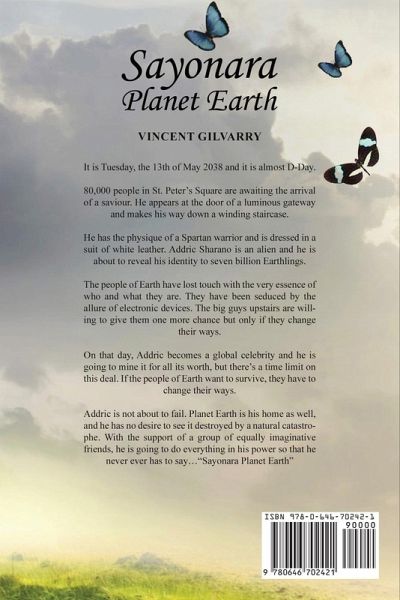It is Tuesday, the 13th of May 2038 and it's almost D-Day.80,000 people in St. Peter's Square are awaiting the arrival of a saviour who appears at the door of a luminous gateway and makes his way down a winding staircase.He has the physique of a Spartan warrior and is dressed in a suit of white leather. Addric Sharano is an alien and is about to reveal his identity to seven billion Earthlings.The people of Earth have lost touch with the very essence of who and what they are. They have been seduced by the allure of electronic devices. The big guys upstairs are willing to give them one more chance but only if they change their ways. On that day, Addric becomes a global celebrity and he is going to mine it for all its worth, but there's a time limit on this deal. If the people of Earth want to survive, they have to change their ways.Addric is not about to fail. Planet Earth is his home as well, and he has no desire to see it destroyed by a natural catastrophe. With the support of a group of equally imaginative friends, he is going to do everything in his power so that he never ever has to say... "Sayonara Planet Earth"