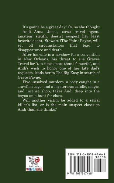 It's gonna be a great day! Or, so she thought. Andi Anna Jones, so-so travel agent, amateur sleuth, doesn't suspect her least favorite client, Stewart (The Pain) Payne, will set off circumstances that lead to disappearance and death. After his wife is a no-show for a convention in New Orleans, his threat to sue Graves Travel for "ten times more than it's worth", and Andi's wish to honor one of her late dad's requests, leads her to The Big Easy in search of Grace Payne. Five unsolved murders, a body caught in a crawfish cage, and a mysterious candle, magic, and incense shop, takes Andi deep into the bayou on a hunt for clues. Will another victim be added to a serial killer's list, or is the main suspect closer to Andi than she thinks?