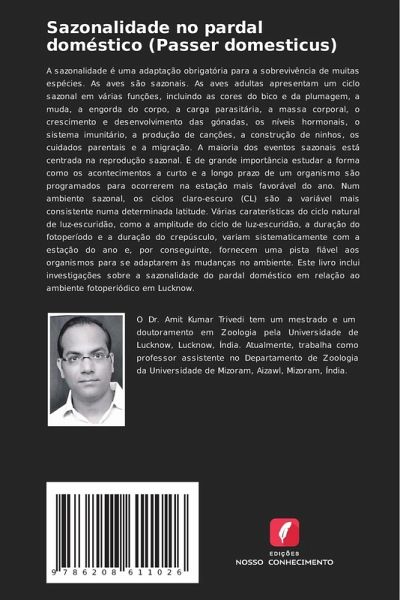 A sazonalidade é uma adaptação obrigatória para a sobrevivência de muitas espécies. As aves são sazonais. As aves adultas apresentam um ciclo sazonal em várias funções, incluindo as cores do bico e da plumagem, a muda, a engorda do corpo, a carga parasitária, a massa corporal, o crescimento e desenvolvimento das gónadas, os níveis hormonais, o sistema imunitário, a produção de canções, a construção de ninhos, os cuidados parentais e a migração. A maioria dos eventos sazonais está centrada na reprodução sazonal. É de grande importância estudar a forma como os acontecimentos a curto e a longo prazo de um organismo são programados para ocorrerem na estação mais favorável do ano. Num ambiente sazonal, os ciclos claro-escuro (CL) são a variável mais consistente numa determinada latitude. Várias caraterísticas do ciclo natural de luz-escuridão, como a amplitude do ciclo de luz-escuridão, a duração do fotoperíodo e a duração do crepúsculo, variam sistematicamente com a estação do ano e, por conseguinte, fornecem uma pista fiável aos organismos para se adaptarem às mudanças no ambiente. Este livro inclui investigações sobre a sazonalidade do pardal doméstico em relação ao ambiente fotoperiódico em Lucknow.