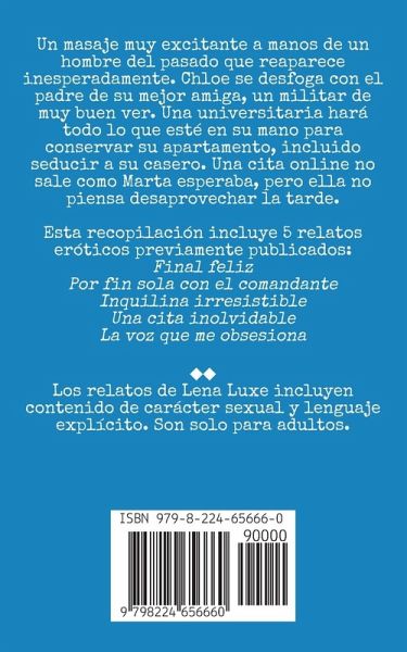 Un masaje muy excitante a manos de un hombre del pasado que reaparece inesperadamente. Chloe se desfoga con el padre de su mejor amiga, un militar de muy buen ver. Una universitaria hará todo lo que esté en su mano para conservar su apartamento, incluido seducir a su casero. Una cita online no sale como Marta esperaba, pero ella no piensa desaprovechar la tarde. Esta recopilación incluye 5 relatos eróticos previamente publicados: Final feliz Por fin sola con el comandante Inquilina irresistible Una cita inolvidable La voz que me obsesiona ¿¿ Los relatos de Lena Luxe incluyen contenido de carácter sexual y lenguaje explícito. Son solo para adultos.