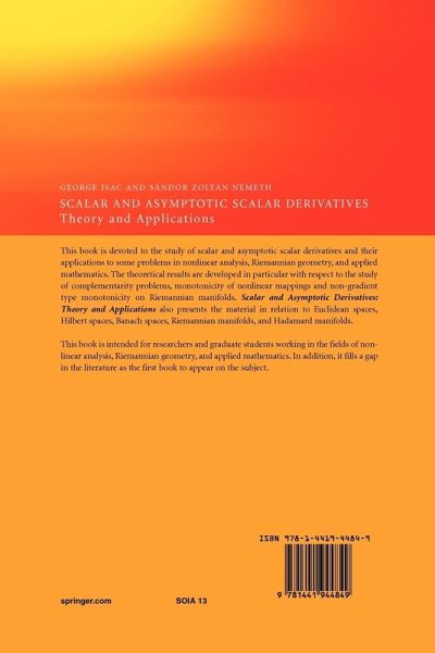 This book is devoted to the study of scalar and asymptotic scalar derivatives and their applications to the study of some problems considered in nonlinear analysis, in geometry, and in applied mathematics. The notion of a scalar derivative is due to S. Z. Nemeth, ´ and the notion of an asymptotic scalar derivative is due to G. Isac. Both notions are recent, never considered in a book, and have interesting applications. About applications, we cite applications to the study of complementarity problems, to the study of xed points of nonlinear mappings, to spectral nonlinear analysis, and to the study of some interesting problems considered in differential geometry and other applications. A new characterization of monotonicity of nonlinear mappings is another remarkable application of scalar derivatives. A relation between scalar derivatives and asymptotic scalar derivatives, - alized by an inversion operator is also presented in this book. This relation has important consequences inthe theory of scalar derivatives, and in some applications. For example, this relation permitted us a new development of the method of exceptional family of elements, introduced and used by G. Isac in complementarity theory. Now, we present a brief description of the contents of this book. Chapter 1 is dedicated to the study of scalar derivatives in Euclidean spaces.