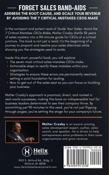 Forget sales band-aids. Address the root cause, and scale your revenue by avoiding the 7 critical mistakes CEOs make. In the compact and potent read of Scale Your Sales: Avoid the 7 Critical Mistakes CEOs Make, Walter Crosby distills 30 years of sales mastery into a 90-minute guide for CEOs at a critical juncture. This book is not just a read; it's the beginning of a journey to pinpoint and resolve your sales dilemmas while showing you the strategies used to scale. Inside this short, powerful book, you will explore: The seven most critical sales mistakes CEOs make Actionable steps to rectify these mistakes within your organization Strategies to ensure these errors are permanently resolved, setting a solid foundation for scaling How to get out of the sales seat so you can focus on building your business Walter Crosby's approach is practical, direct, and rooted in real-world successes, making this book an indispensable tool for business leaders determined to see their companies thrive. By committing just 90 minutes to this read, you're not just flipping through pages; you're setting the stage for your company's future.