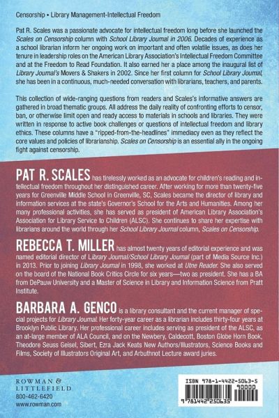 Scales on Censorship: Real Life Lessons from School Library Journal contains Pat R. Scales collected columns, all written in response to active book challenges or questions of intellectual freedom and library ethics. These columns have a ripped from the headlines immediacy even as they reflect the core values and policies of librarianship. They are organized by topic and each is framed with a brief new introductory essay. Scales’ powerful reputation and practical ethically-based solutions has made her a key spokesperson and support for librarians working under a censorship siege.