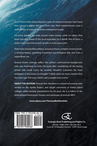 Scam Artists of the Galaxy features a pair of creative scammers who travel from planet to planet 450 years from now. Their misadventures cover a wide variety of scams in nineteen widespread locales. On some planets the male cousins make money, while on others they leave one step ahead of the local equivalent to a sheriff. One of them, a ladies' man, even tries to pick up girls at every space port. Their tricks include fake artifacts, insurance fraud, complex currency tricks, a missing heiress, gambling, fraudulent psychological aids, and even a supercilious cat. Several stories strongly reflect the author's astronomical background, who was motivated to write the book after considering all the boring phone and email scams he receives. Wouldn't scammers be more intelligent in the future, he thought. "I think mine are more creative than the ones I get. Felt sorry I didn't add a couple more scams." About the Author: Thomas Wm. Hamilton is a retired astronomer who worked on the Apollo Project, and taught astronomy at Staten Island colleges while running planetariums for 34 years. He is a Fellow of the International Planetarium Society and namesake of asteroid 4897.